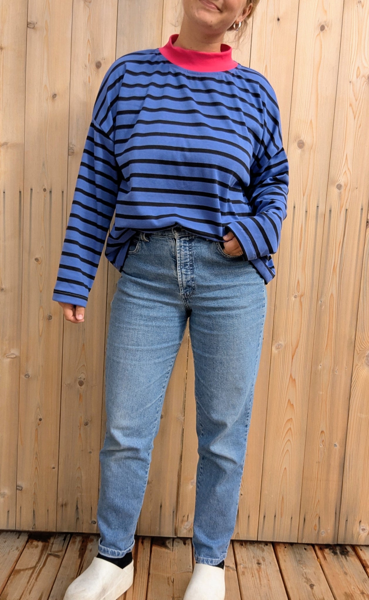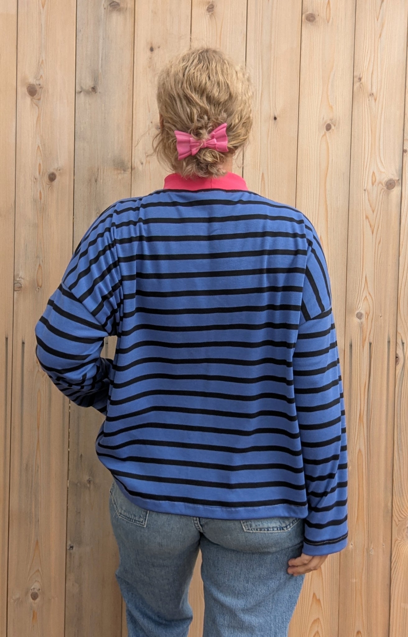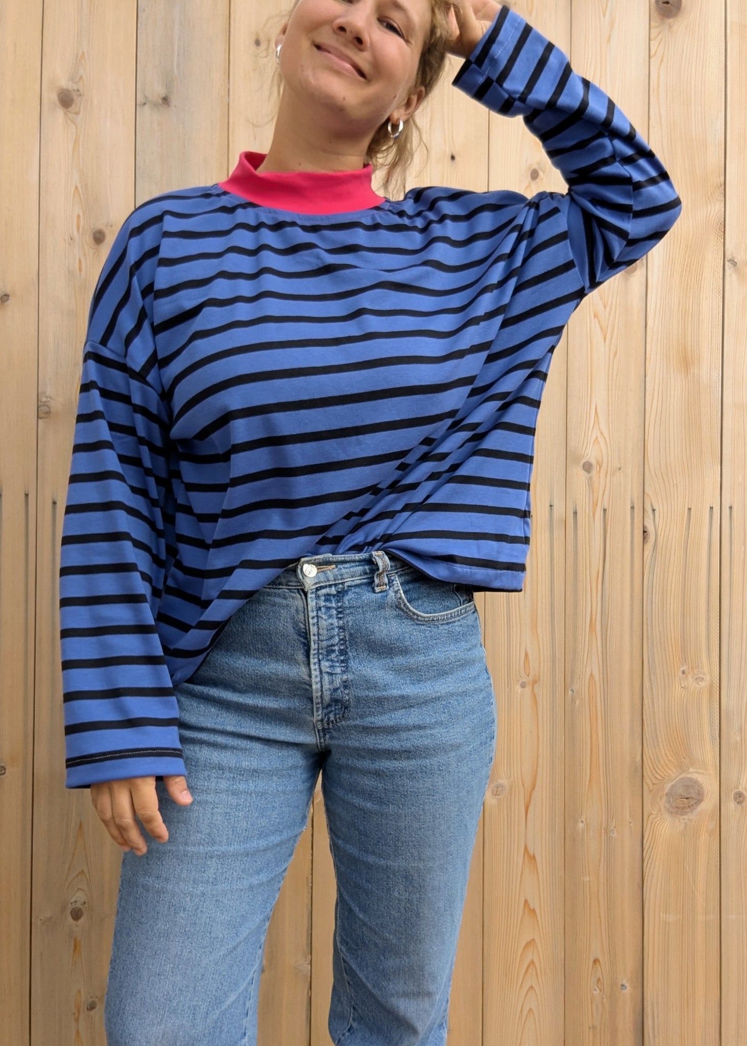 Bleu foncé à rayures noires, col haut en rib rose pétant