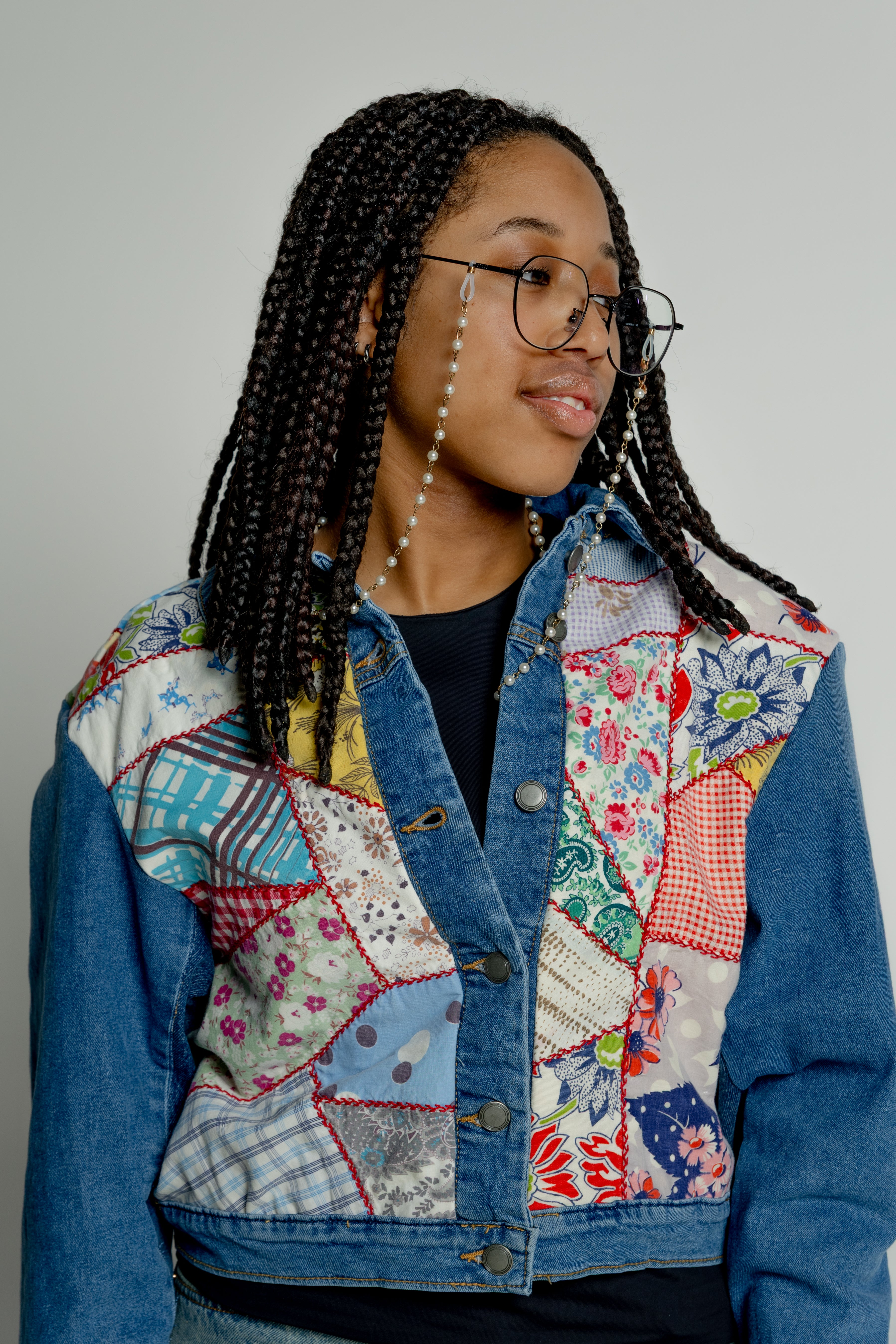 - Parfaite veste d’entre saisons, composée de jeans et de courte-pointe artisanale piquée à la main, style "crazy quilt".