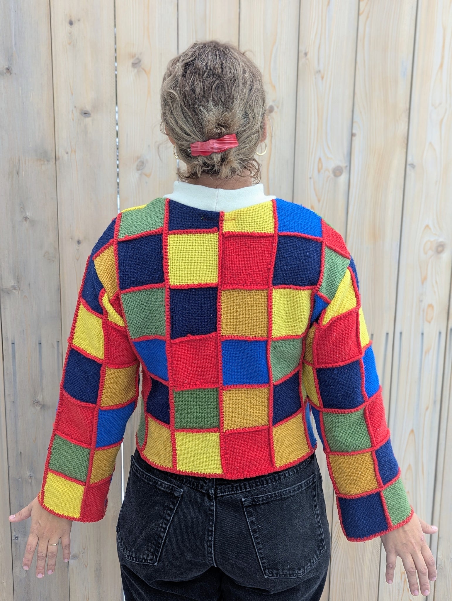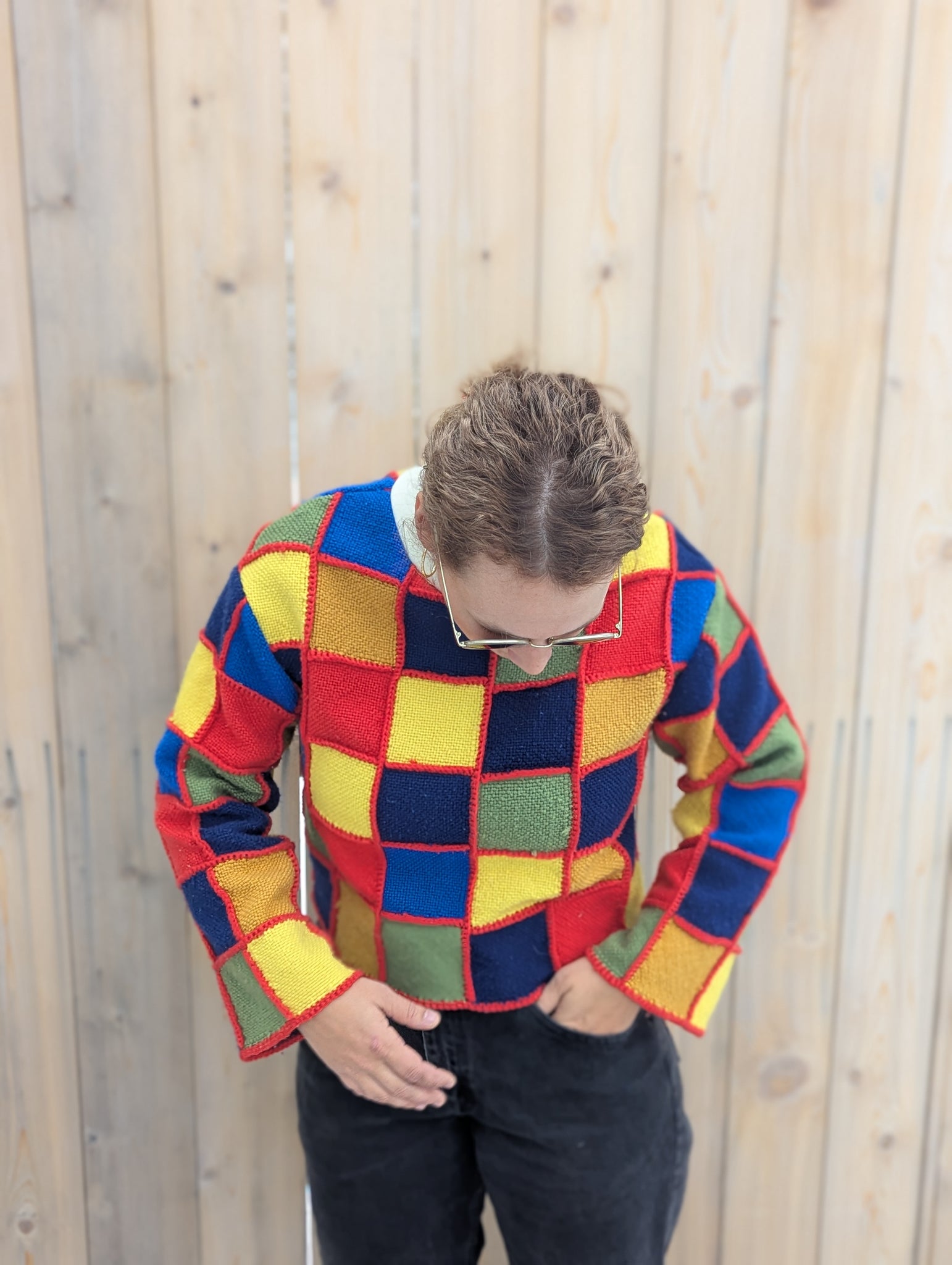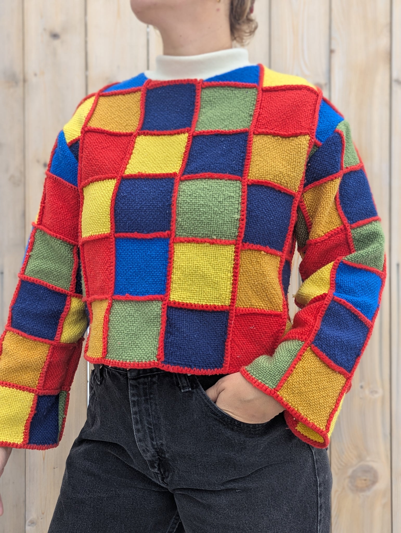 Exceptionnelle couverture damier tricotée à la main revalorisée en pull