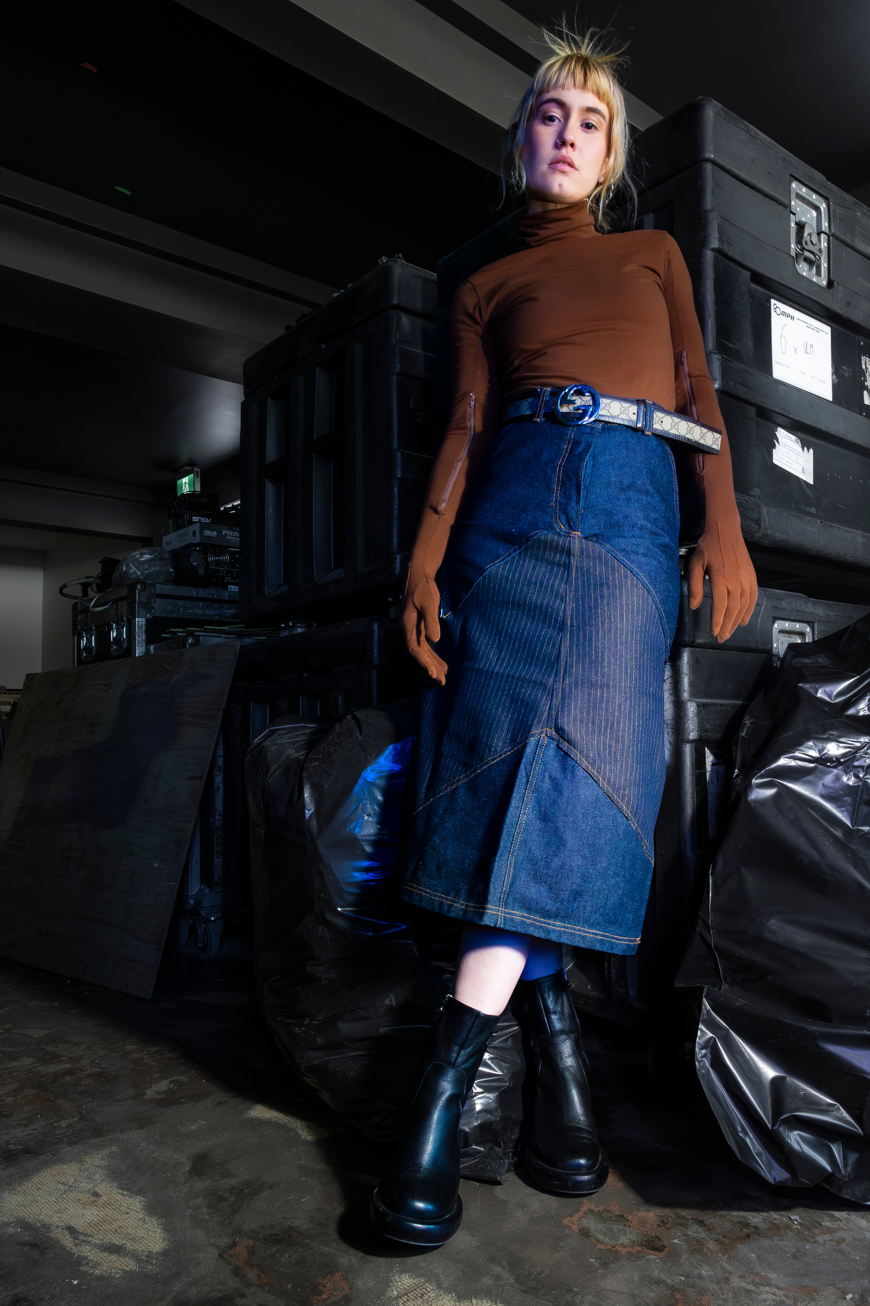 - Jupe midi: Patchwork structuré, taille haute
