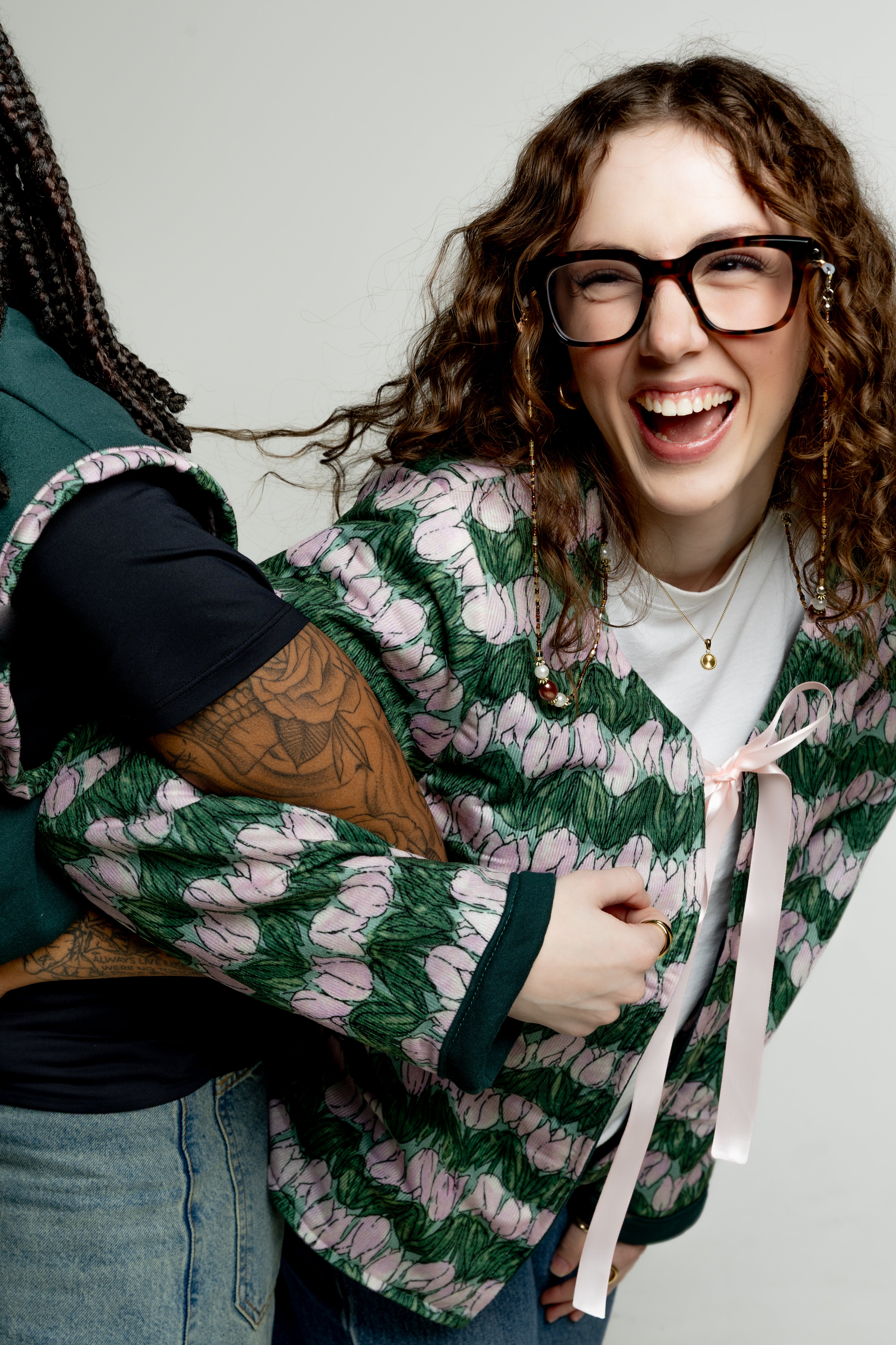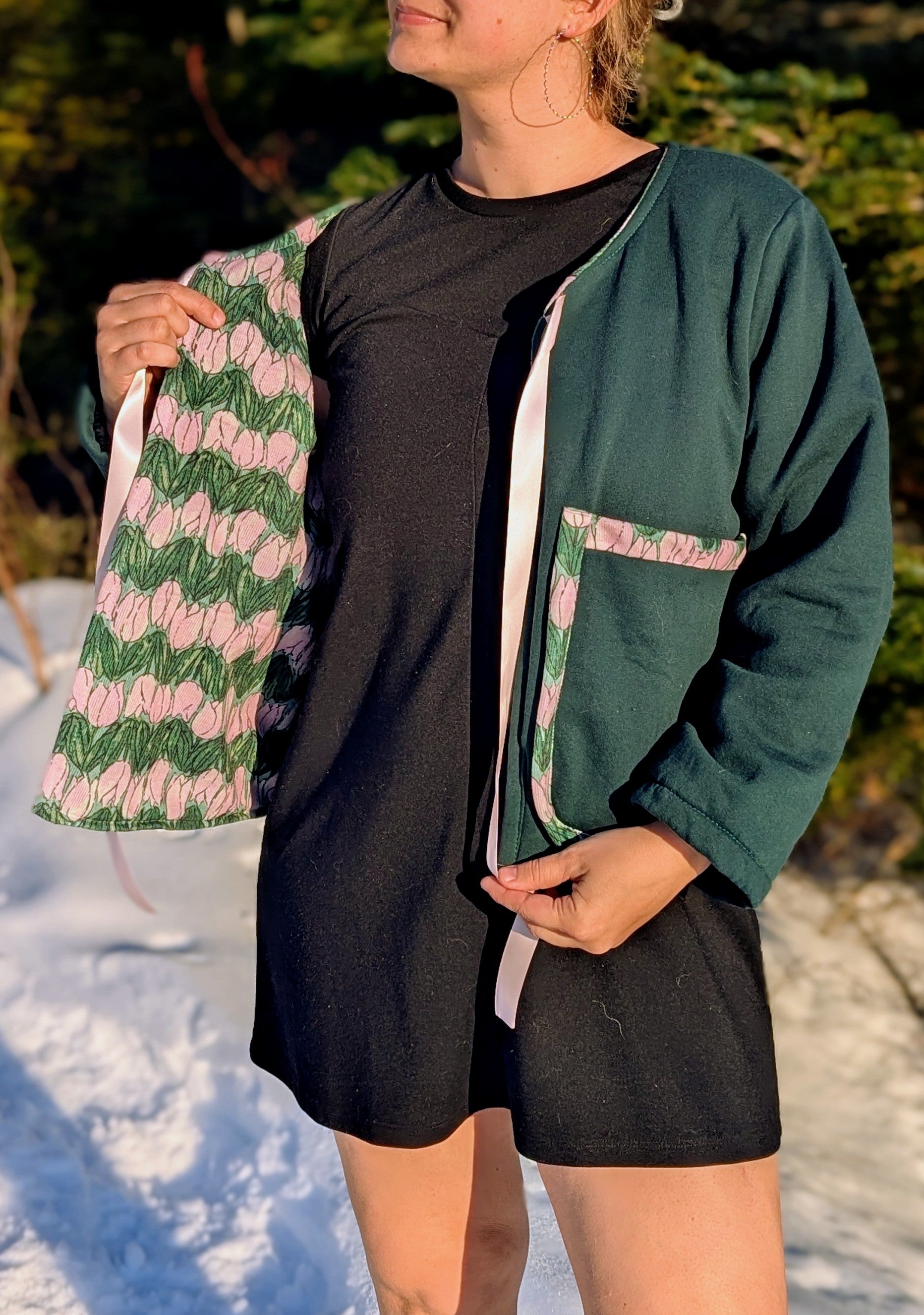 - Corduroy vintage à imprimé de tulipes roses d’un côté, fleece vert forêt de l’autre